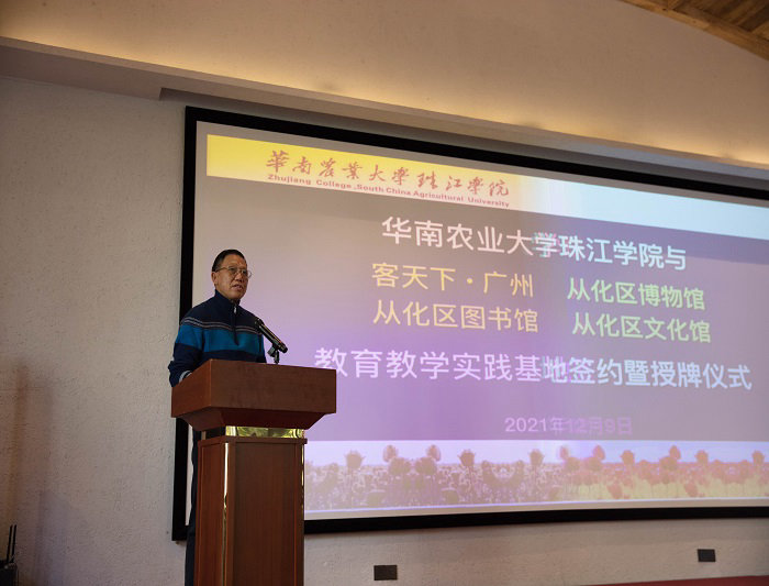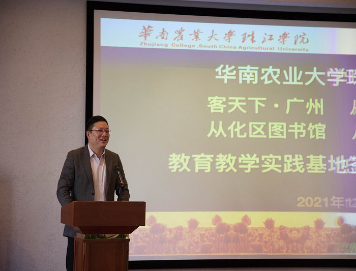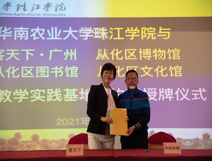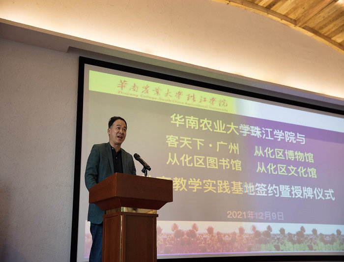 12月9日下午,华南农业大学珠江学院传媒学院与从化区图书馆、区文化馆、区博物馆、鸿客集团广州公司在客天下•广州国际旅游度假区幸福厅举行了教育教学实践基地签约暨授牌仪式(以下各单位简称为“华珠传媒”、“区图书馆”、“区文化馆”、“区博物馆”、“广州客天下”),从化区常委、宣传部部长骆志雄与从化区文广旅体局总工程师申国海莅临指导,从化区图书馆馆长邱跃、区文化馆馆长冯奕华、区博物馆馆长李小梅和华南农业大学珠江学院董事长宫俊全、华珠传媒学院院长梁深洪、华珠传媒学院党总支书记周玲军应邀到场。集团董事长蔡鸿章、广州公司总经理许文、集团董助申晓出席本次仪式。 从化区委区政府、区图书馆、区文化馆和区博物馆代表(左)与华珠传媒团队、客天下团队(右)签约暨授牌仪式现场仪式开始前,骆志雄常委代表从化区委区政府,对本次签约挂牌合作表示高度认可,认为五方共融共建教育教学实践基地,正是回答习近平总书记最关心的“如何将文化传播到每一个地方”这一问题的有力举措。同时,骆志雄常委对未来政校企各方优势互通、共创共赢表达了深切期待,希望广州客天下与区图书馆、区文化馆、区博物馆、华珠传媒着眼高处,“努力做民心相通的传播者,人文交流的促进者,为弘扬全人类的共同价值、推动构建人类共同体作出应有的贡献”,区图书馆、区文化馆、区博物馆作为宣传系统的重要组成部分,也将延续从化区委区政府的服务精神,对口支持高校人才培育需求和企业经营需要。