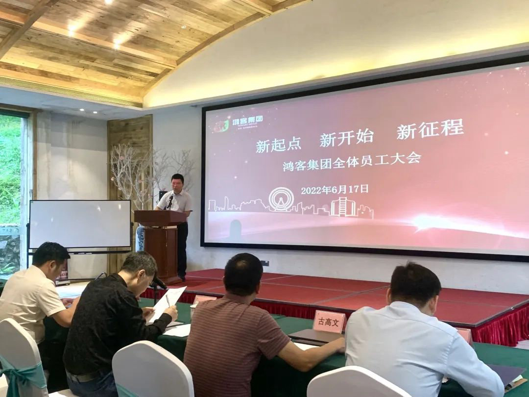 2022年6月17日,“新起点、新开始、新征程——鸿客集团全员大会”在广州客天下正式召开。广东鸿客集团董事长蔡鸿章、总裁蔡雪辉等领导及集团各公司、各部门人员出席会议,会议由鸿客集团总裁助理曾金杰主持,会议主要就近期鸿艺集团改革所涉及到的相关事项作了具体宣贯及动员。
